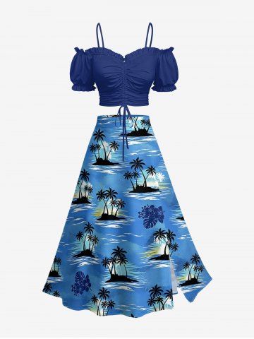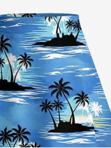 Plus Size Coconut Tree Sea Tropical Leaf Hibiscus Flower Print Hawaii Split A Line Skirt - Sky Blue - S