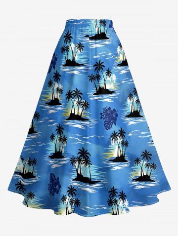 Plus Size Coconut Tree Sea Tropical Leaf Hibiscus Flower Print Hawaii Split A Line Skirt - Sky Blue - M