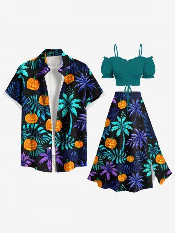 Plus Size Coconut Tree Tropical Leaf Pumpkin Print Halloween Split A Line Skirt - Black - 1x
