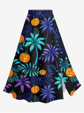 Plus Size Coconut Tree Tropical Leaf Pumpkin Print Halloween Split A Line Skirt - Black - 5x