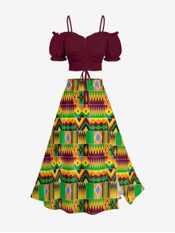 Plus Size Ethnic Pattern Print Split Skirt - Green - S