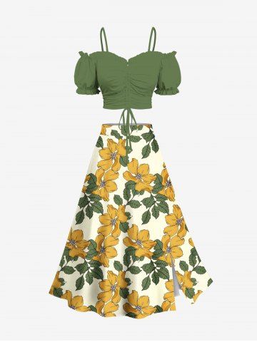 Plus Size Flower Leaf Print Hawaii Split A Line Skirt - Beige - 4x