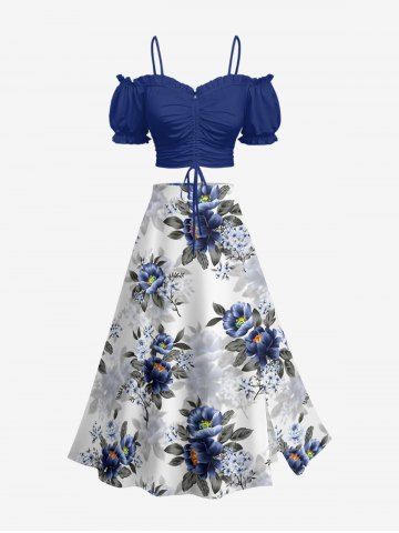 Plus Size Flower Leaf Print Hawaii Split A Line Skirt - White - L