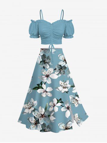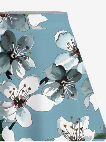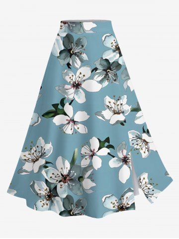Plus Size Flower Leaf Print Hawaii Split A Line Skirt - Blue Gray - S