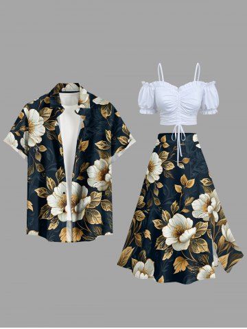 Plus Size Flower Leaf Print Hawaii Split A Line Skirt - Deep Blue - 2x