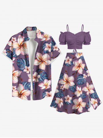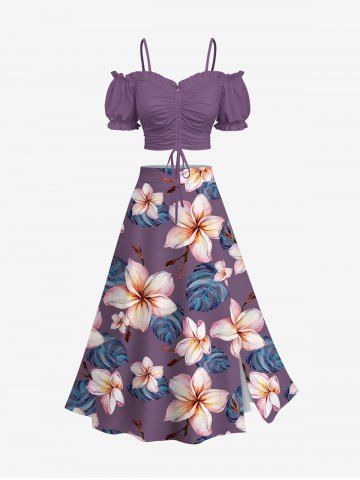 Plus Size Flowers Leaf Print Split Hawaii Skirt - Purple - Xs