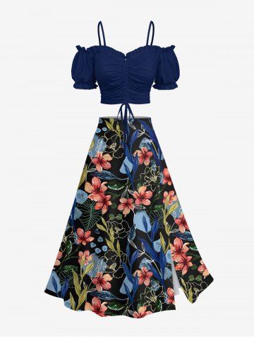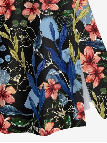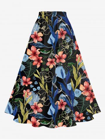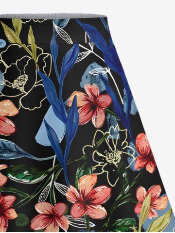 Plus Size Flowers Leaf Print Split Hawaii Skirt - Black - S