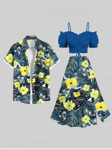 Plus Size Flowers Tropical Leaf Print Split Hawaii Skirt - Blue - M