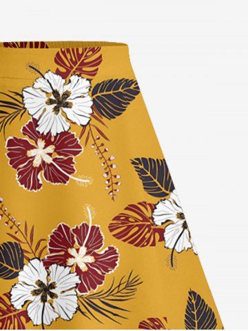 Plus Size Hibiscus Flower Tropical Leaf Print Split Hawaii Skirt - Yellow - Xs