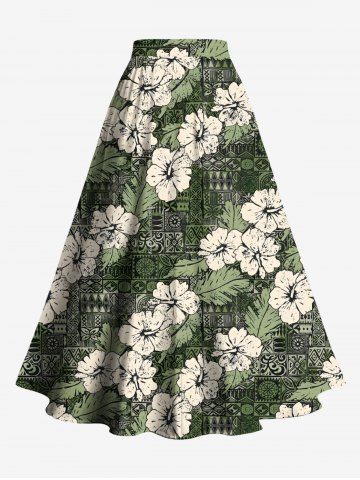 Plus Size Hibiscus Flowers Leaf Scarf Print Split Hawaii Skirt - Green - 2x