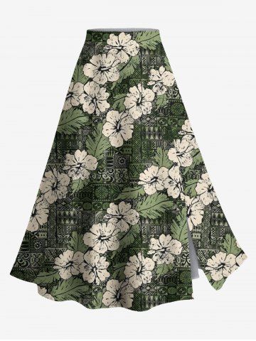 Plus Size Hibiscus Flowers Leaf Scarf Print Split Hawaii Skirt - Green - 3x