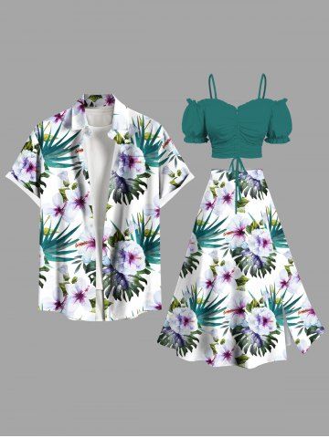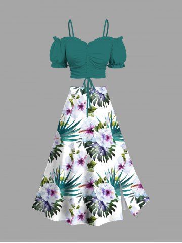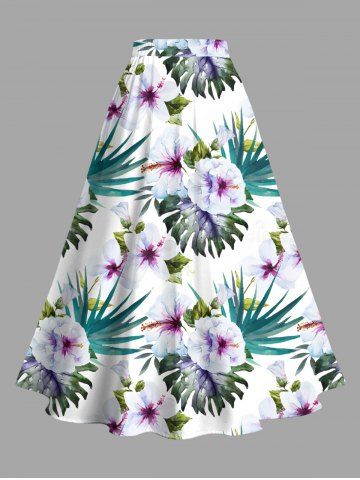 Plus Size Hibiscus Flowers Tropical Leaf Print Split Hawaii Skirt - White - 2x