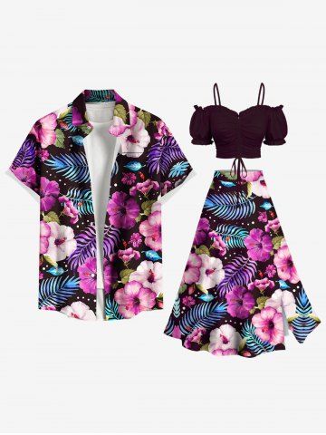 Plus Size Hibiscus Flowers Tropical Leaf Print Split Hawaii Skirt - Purple - Xs