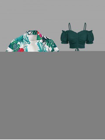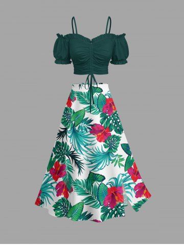 Plus Size Hibiscus Flowers Tropical Leaf Print Split Hawaii Skirt - Green - Xs
