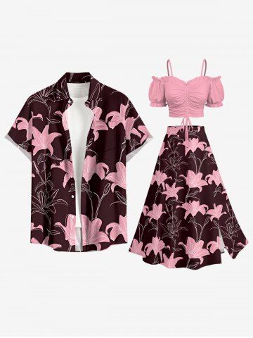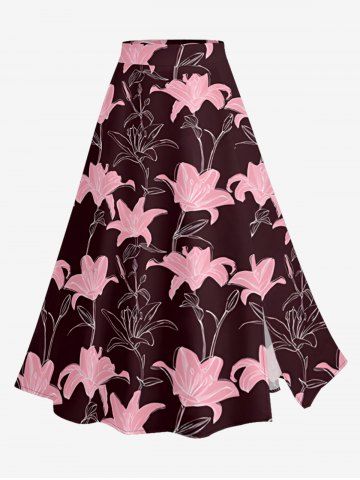 Plus Size Lily Flower Print Hawaii Split A Line Skirt - Deep Red - M