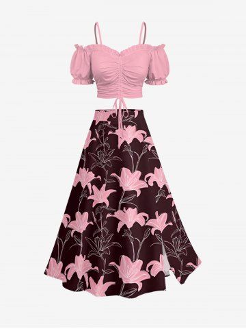Plus Size Lily Flower Print Hawaii Split A Line Skirt - Deep Red - L