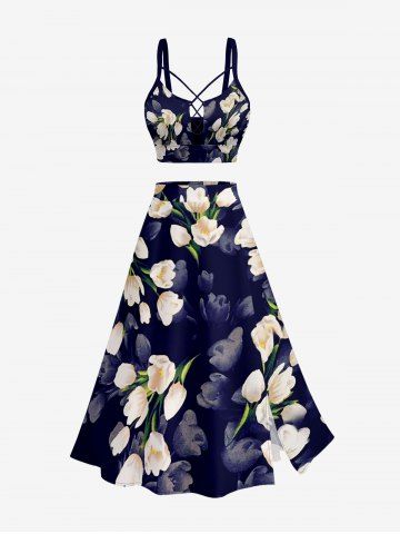 Plus Size Ombre Flower Print Hawaii Split A Line Skirt - Deep Blue - 5x