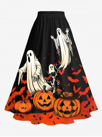 Graphic Skirts > Plus Size Pumpkin Ghost Bat Tree Print Halloween Split A Line Skirt