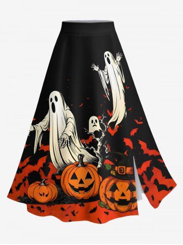 Graphic Skirts > Plus Size Pumpkin Ghost Bat Tree Print Halloween Split A Line Skirt