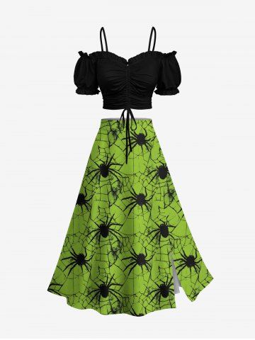 Plus Size Spider Web Insect Print Halloween Split A Line Skirt - Green - 3x