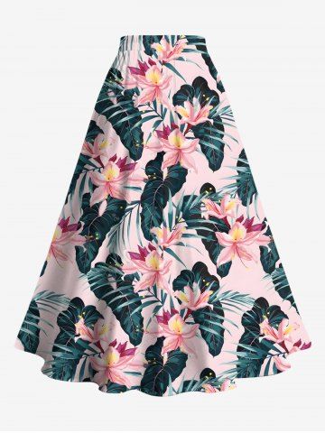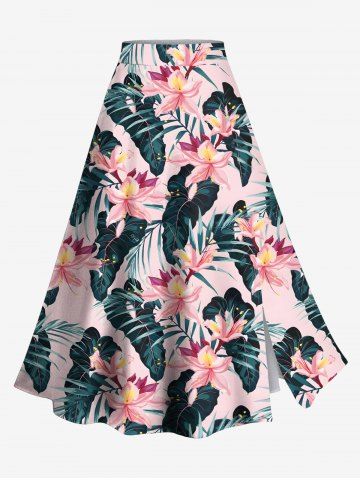 Plus Size Tropical Flower Leaf Print Split Hawaii Skirt - Light Pink - 2x