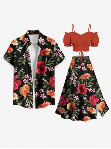 Plus Size Tropical Leaf Hibiscus Flower Print Hawaii Split A Line Skirt - Black - S