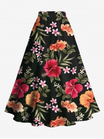 Plus Size Tropical Leaf Hibiscus Flower Print Hawaii Split A Line Skirt - Black - L