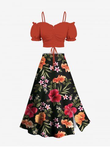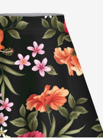 Plus Size Tropical Leaf Hibiscus Flower Print Hawaii Split A Line Skirt - Black - 5x
