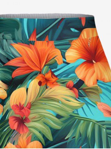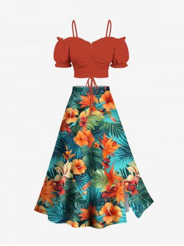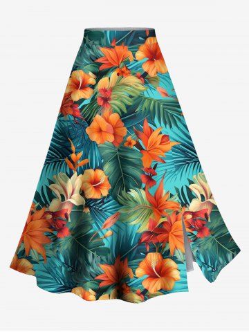 Plus Size Tropical Leaf Hibiscus Flower Print Hawaii Split A Line Skirt - Green - S