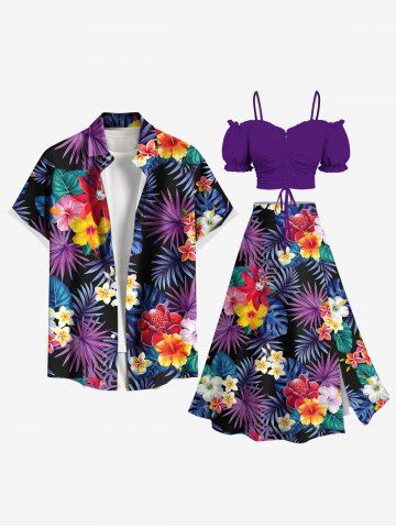 Plus Size Tropical Leaf Hibiscus Flower Print Hawaii Split A Line Skirt - Concord - 4x