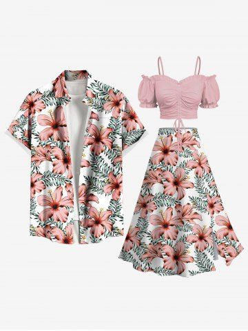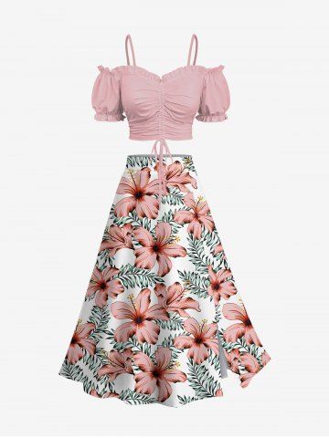 Plus Size Tropical Leaf Hibiscus Flower Print Hawaii Split A Line Skirt - Light Pink - 2x