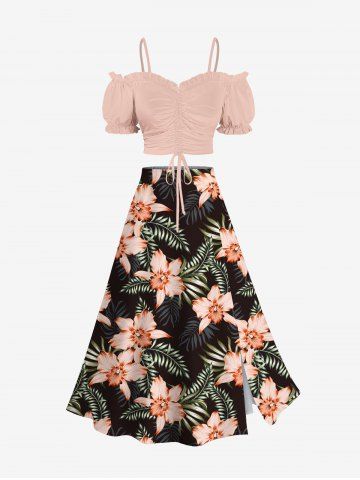 Plus Size Tropical Leaf Hibiscus Flower Print Hawaii Split A Line Skirt - Black - Xs