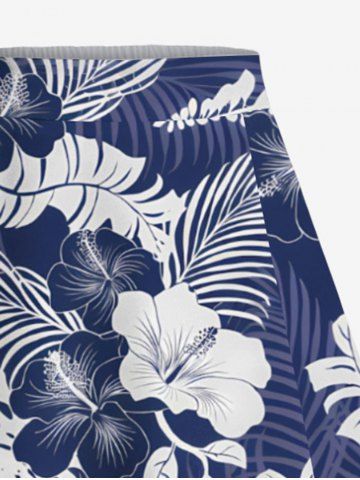 Plus Size Tropical Leaf Hibiscus Flower Print Hawaii Split A Line Skirt - Navy Blue - 1x