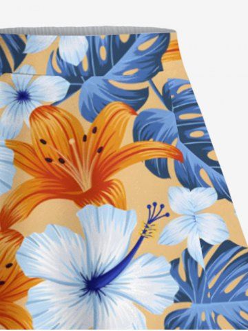 Plus Size Tropical Leaf Hibiscus Flower Print Hawaii Split A Line Skirt - Sky Blue - S