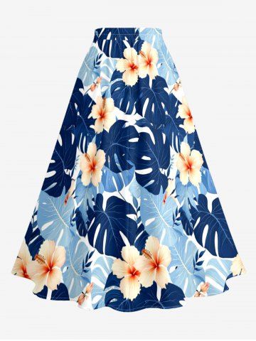 Plus Size Tropical Leaf Hibiscus Flower Print Hawaii Split A Line Skirt - Blue - 4x