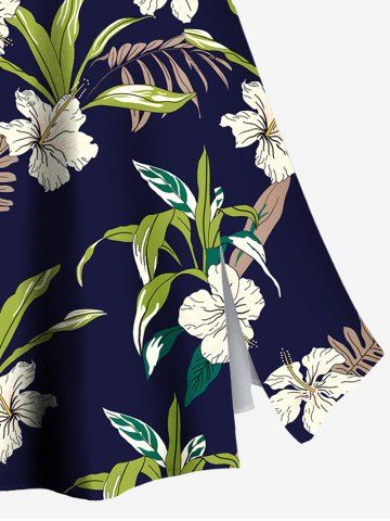 Plus Size Tropical Leaf Plant Hibiscus Flower Print Hawaii Split A Line Skirt - Black - M