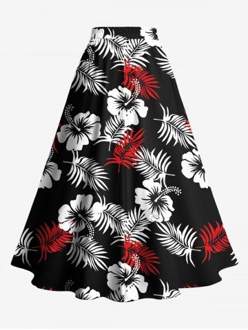 Plus Size Two Tone Tropical Leaf Hibiscus Flower Print Hawaii Split A Line Skirt - Black - M