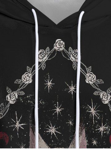 Plus Size Rose Flower Trim Rhombus Cat Bowknot Galaxy Print Pocket Drawstring Pullover Hoodie - Black - L