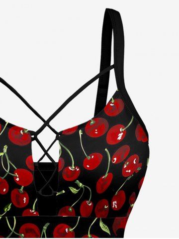 Cherry Fruit Print Hawaii Lace Up Tankini Swimsuit (Adjustable Shoulder Strap) - Black - Xs