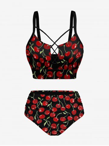 Cherry Fruit Print Hawaii Lace Up Tankini Swimsuit (Adjustable Shoulder Strap) - Black - 5x