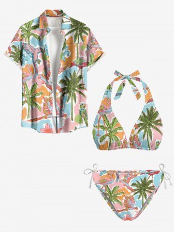 Graphic Swimwear > Coconut Tree Hibiscus Flower Parrot Flamingo Print Hawaii Plunging Halter Backless Bikini Set