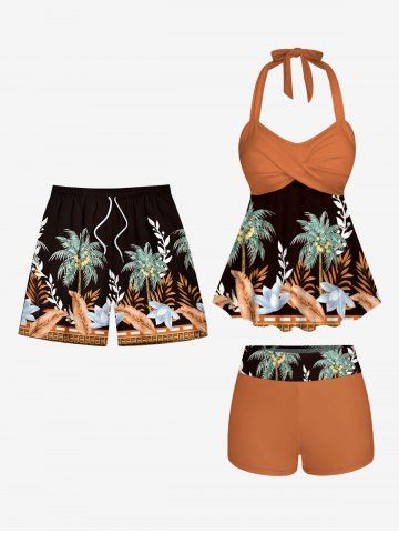 Coconut Tree Tropical Leaf Flower Print Hawaii Twist Halter Boyleg Tankini Swimsuit - Deep Brown - 1x