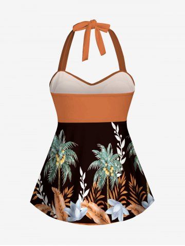 Coconut Tree Tropical Leaf Flower Print Hawaii Twist Halter Boyleg Tankini Swimsuit - Deep Brown - 2x