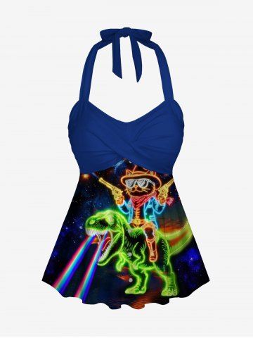 Dinosaur Cat Planet Galaxy Print Hawaii Twist Halter Backless Boyleg Tankini Swimsuit - Deep Blue - 1x