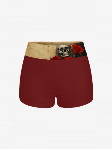 Distressed Skull Rose Flower Print Halloween Twist Halter Backless Boyleg Tankini Swimsuit - Red Wine - 2x