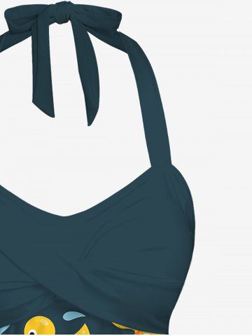 Graphic Swimwear > Duck Water Drop Print Hawaii Twist Halter Backless Cinched Boyleg Tankini Swimsuit