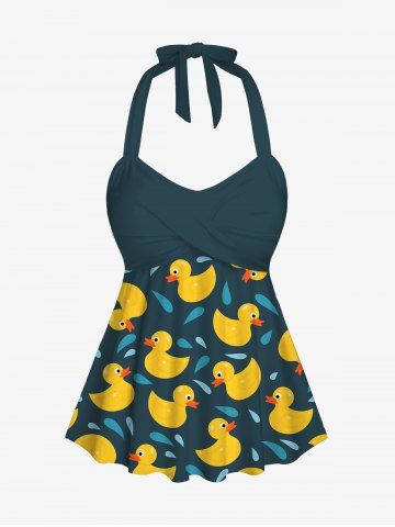 Graphic Swimwear > Duck Water Drop Print Hawaii Twist Halter Backless Cinched Boyleg Tankini Swimsuit