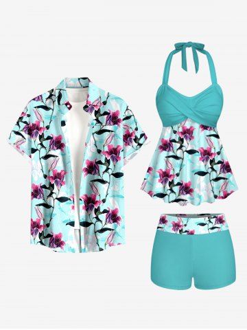 Graphic Swimwear > Flower Leaf Branch Print Hawaii Twist Halter Boyleg Tankini Swimsuit