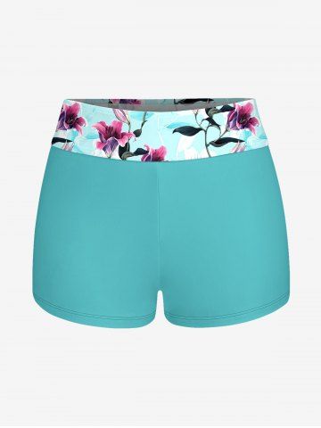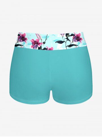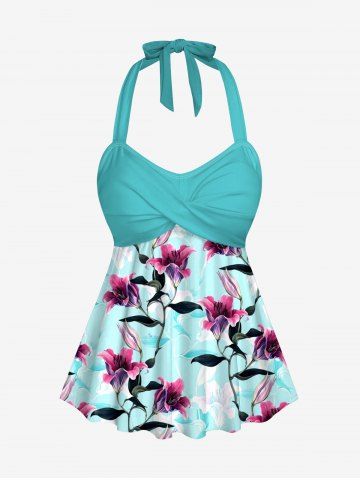 Flower Leaf Branch Print Hawaii Twist Halter Boyleg Tankini Swimsuit - Turquoise - M