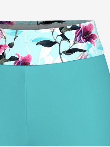 Flower Leaf Branch Print Hawaii Twist Halter Boyleg Tankini Swimsuit - Turquoise - 6x